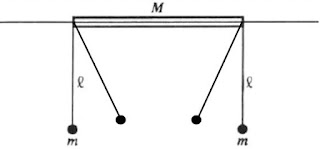 A cylindrical tube of mass M can slide on a horizontal wire. Two identical pendulum, each of mass m and length l, hang from the ends of the tube, as shown above. For small oscillations of the pendulums in the plane of the paper, the eigenfrequencies of the normal modes of oscillation of the system are 0,